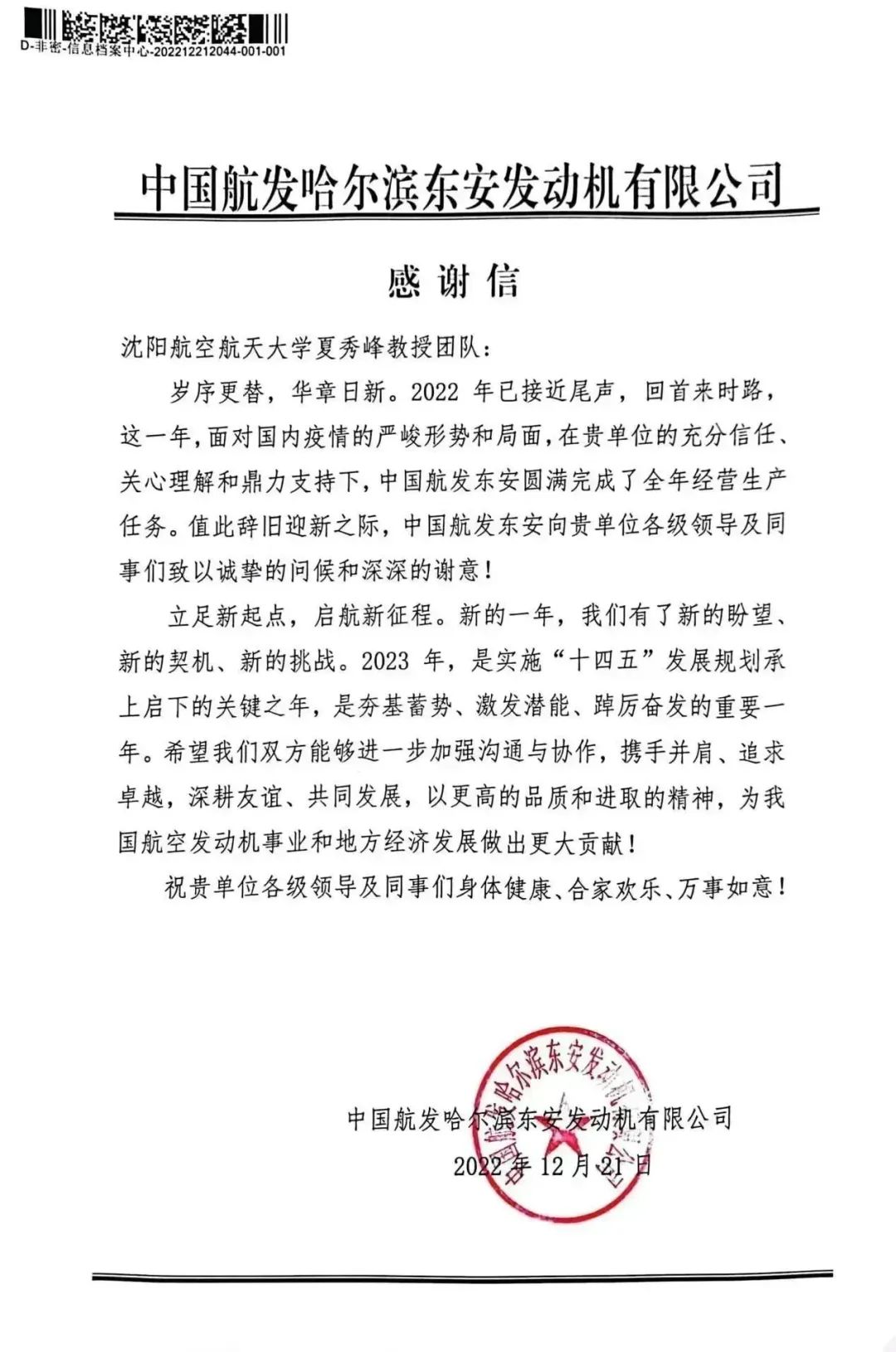 2022年12月21日,中国航发哈尔滨东安发动机有限公司给学校发来感谢信,感谢学校,尤其是学校计算机学院的夏秀峰教授团队在其2022年度圆满完成全年经营生产任务中所给予的鼎力支持。从2002年开始,学校计算机学院夏秀峰教授团队在智能制造、工业大数据处理及企业信息化等多个领域上,与中国航发哈尔滨东安发动机有限公司进行了密切合作。尤其是2019年学校与东安公司签订战略合作框架协议以来,双方合作更加稳定,合作领域不断拓...