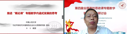 秦宣教授的主题报告为《推进“概论”课专题教学内涵式发展的思考》。秦教授首先阐述了当前高校思政课专题教学的现状。专题教学是一种有逻辑主线链接、主题模块相对独立且有联系的课堂教学模式,具有诸多优点,模式多样。但也存在一些问题,如专题设计不合理、随意;因人因教师所设专题;缺乏集体备课;大班上课,师生之间缺乏互动;教师缺乏对教学内容的整体了解等。为此,秦教授结合党的十九届六中全会精神,提出了关于“概论”课专题设计的方案和建议。
