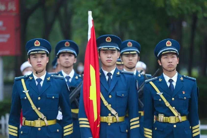 升旗仪式上,学校第十二届国旗护卫队与新一届国旗护卫队共同完成护旗任务交接,这是使命的传承与交接。新一届国旗护卫队郑重承诺:将继承优良传统,发扬过硬作风,不负重托,不辱使命,用“空天蓝”守护“国旗红”,保证完成国旗护卫任务!