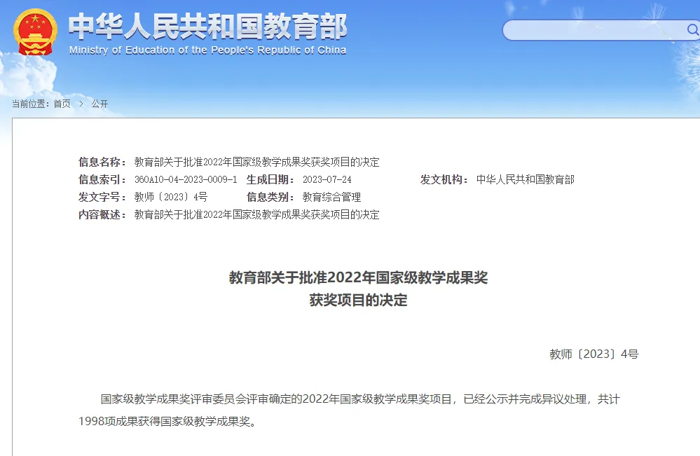 国家级教学成果奖是教育教学领域的最高奖项,是与国家自然科学三大奖(国家自然科学奖、国家技术发明奖、国家科技进步奖)比肩的国家级奖励,教育部每4年评选一次,用于奖励反映教育教学规律,具有独创性、新颖性、实用性,对提高教学水平和教育质量产生明显效果的集体和个人,代表了我国教育教学工作的最高水平。本次高等教育(本科)国家级教学成果奖共评出成果572项,其中特等奖成果2项,一等奖成果70项,二等奖成果500项。