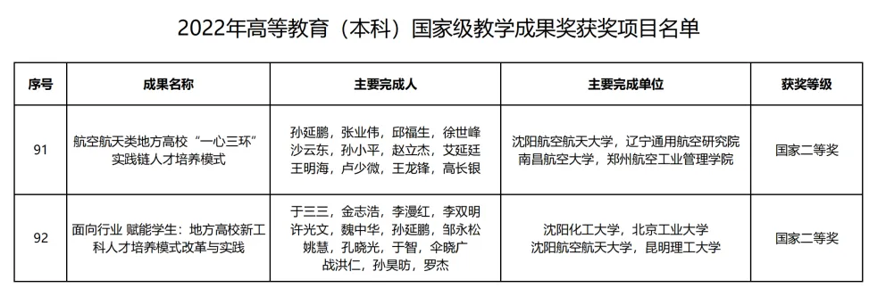 7月24日,教育部发布了《关于批准2022年国家级教学成果奖获奖项目的决定》。学校党委常委、副校长孙延鹏教授领衔的团队成果《航空航天类地方高校“一心三环”实践链人才培养模式》荣获高等教育(本科)国家级教学成果二等奖,实现了学校在教育教学改革中历史性的重大突破。这是学校继2005年后再次荣获国家级教学成果奖。此外,学校与兄弟院校合作完成的《面向行业 赋能学生:地方高校新工科人才培养模式改革与实践》荣获国家级教学成果二等奖。