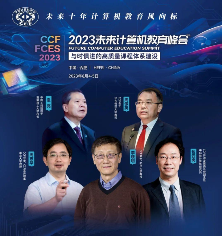 第七届CCF未来计算机教育峰会(FCES2023)于2023年8月4-5日在安徽省合肥市成功举办,会议由CCF会士、中国工程院院士蒋昌俊担任大会主席。峰会紧密围绕“与时俱进的高质量课程体系建设”这一主题,共同探讨计算机教育在智能时代面临的问题和挑战。20余位大学校长、100余名计算机学科相关学院院长,约500位学者、专家参加了本次会议。大会期间,共组织特邀报告、学术论坛、专题研讨等30余场。94位中国计算机教育领域卓有影响力的学者专家,从101计划、元宇宙课程体系建设、计算机拔尖创新人才培养、地方特色高水平大学计算机教育、教材与课程协同发展、计算机类课程思政、开源课程创新等不同维度出发,探讨课程体系的未来建设,共商未来计算机教育的发展之路。