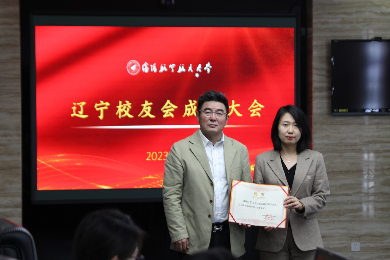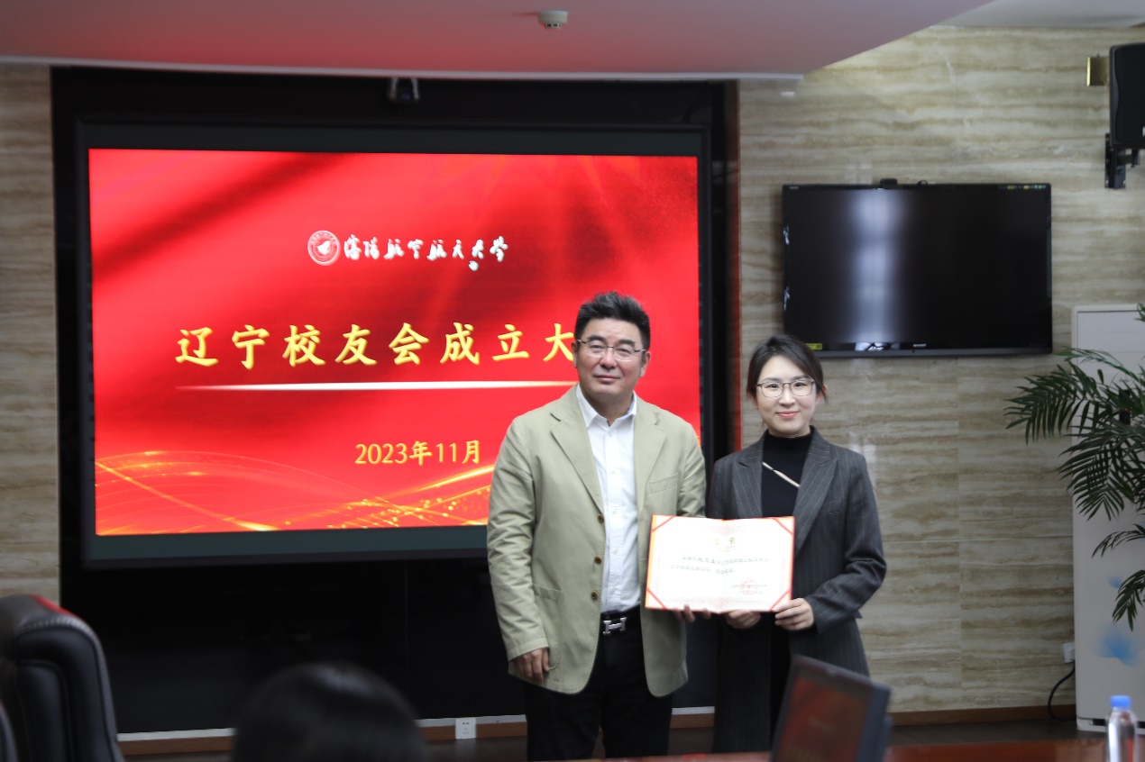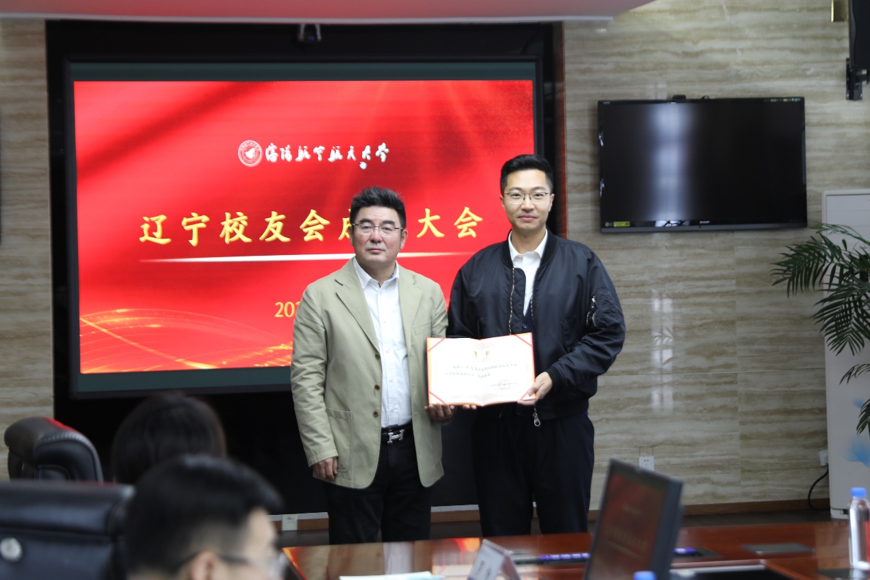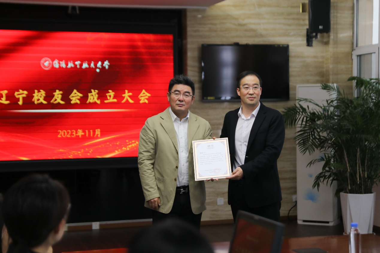 校友总会常务副会长银国涛为首届辽宁校友会会长、秘书长颁发聘书。