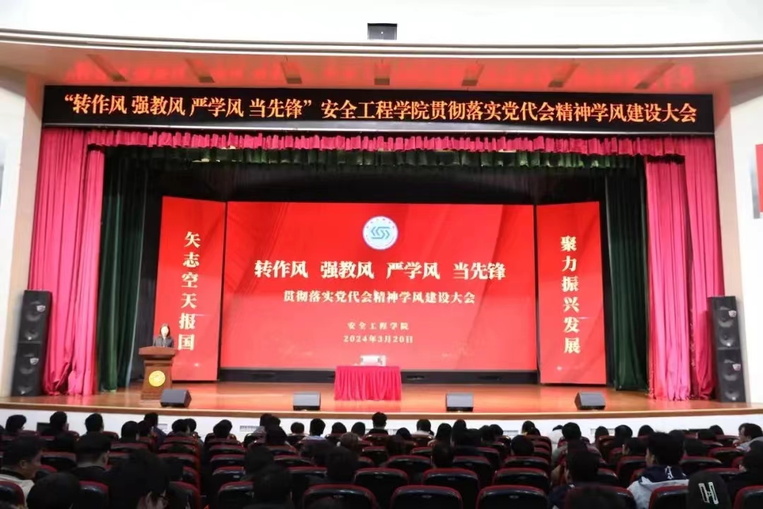 为全面学习传达学校第三次党代会精神,对学院贯彻落实党代会精神作出动员部署,并提升学院作风、教风、学风走深走实、见行见效。3月20日下午,安全工程学院党委于蓝天剧场组织召开“强教风 严学风 当先锋”贯彻落实党代会精神学风建设大会。学院领导班子、全体教职工、全体研究生及2021-2023级本科生参加,会议由学院党委副书记田雪楠主持。