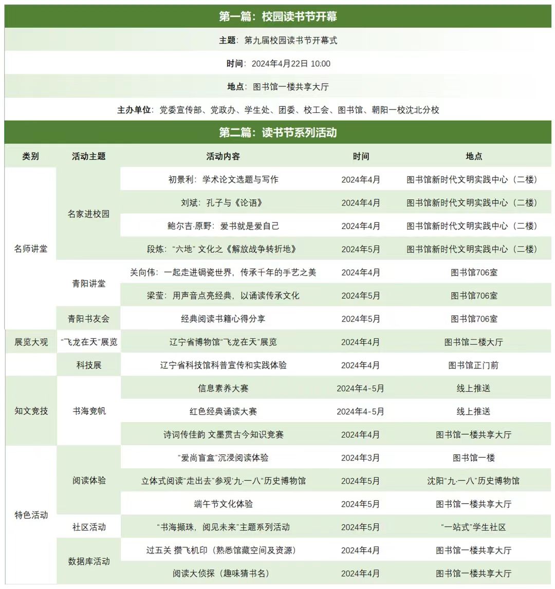 第九届校园读书节实施方案将以“品读季、致用季、启航季、翔远季”四季引领校园阅读新风尚。学校将举办名家进校园系列讲座,邀请中国科学院大学初景利教授、大连理工大学刘斌教授以及鲁迅文学奖获得者、辽宁省作家协会副主席鲍尔吉· 原野作经典阅读讲座。开展青阳讲堂和书友会、开展知识竞赛和系列特色活动,引领读者感受文学之美、触摸文化之魂。