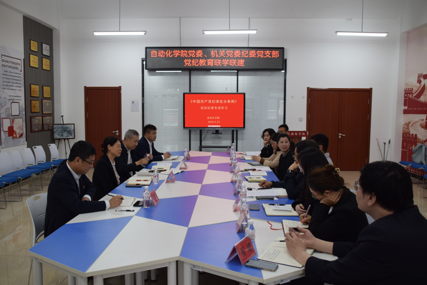 为扎实推进党纪学习教育,强化党员领导干部对《中国共产党纪律处分条例》的学习理解,5月23日下午,自动化学院党委与机关党委纪委党支部共学共研了党的政治纪律专题。ac米兰官网中文网站党委常委、纪委书记孟宪梅、自动化学院两委委员、机关党委纪委党支部全体党员参加学习。本次学习由自动化学院党委书记石峰主持。