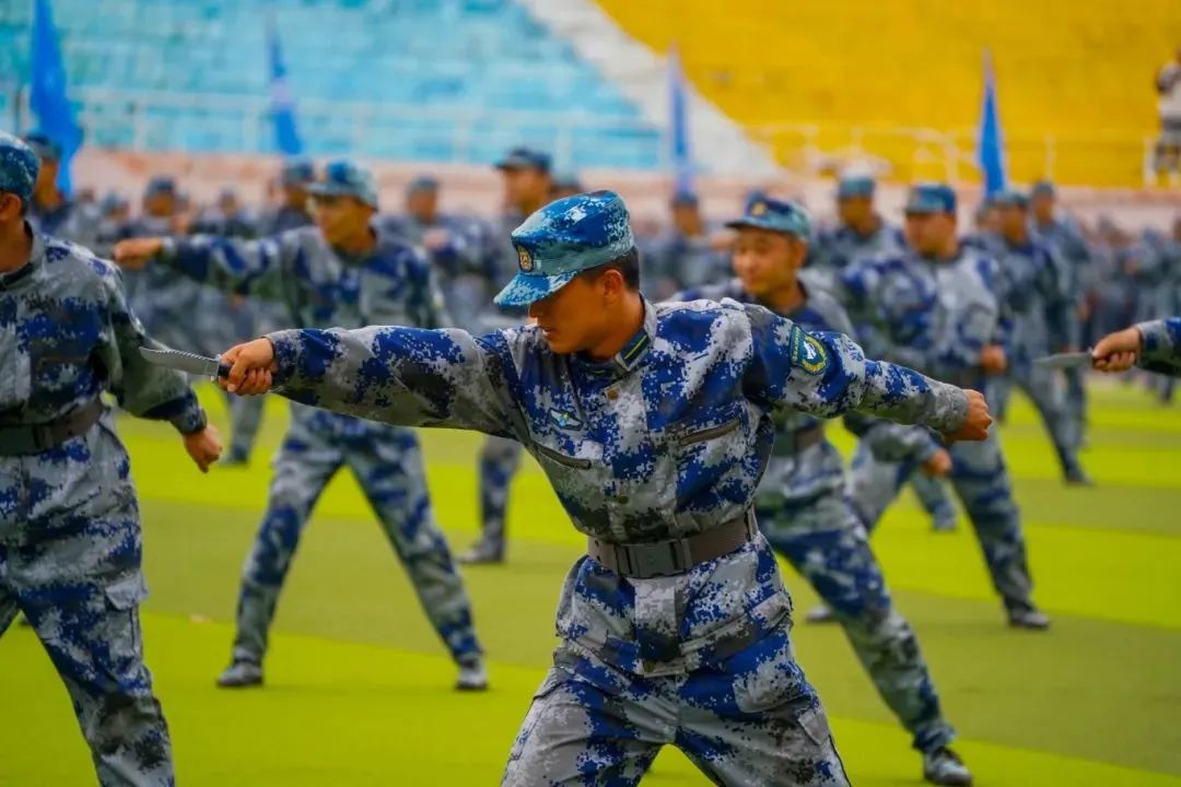 时而蹲跪压刺,时而跃起劈刺,整齐划一,如影随形,威风凛凛,潇洒利落,刀起是飒爽,刀落是坚定,同学们的匕首操表演如同一幅流动的画卷,展现出了他们充满战斗力的身姿与活力,展示了ac米兰学子的风采和战斗意志!