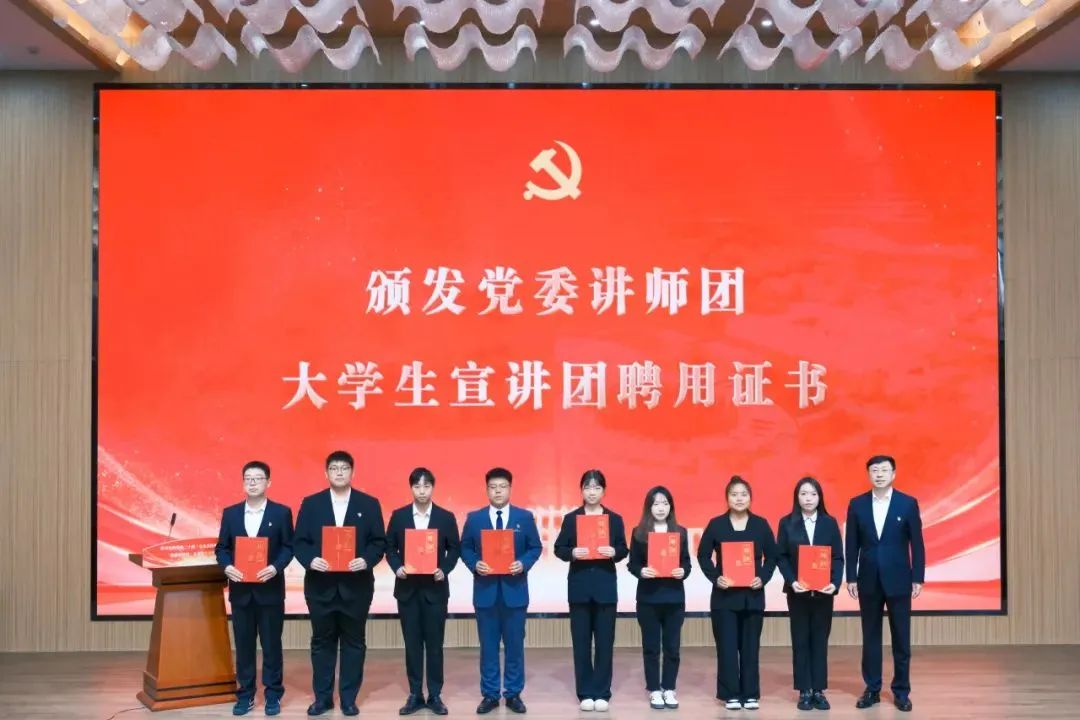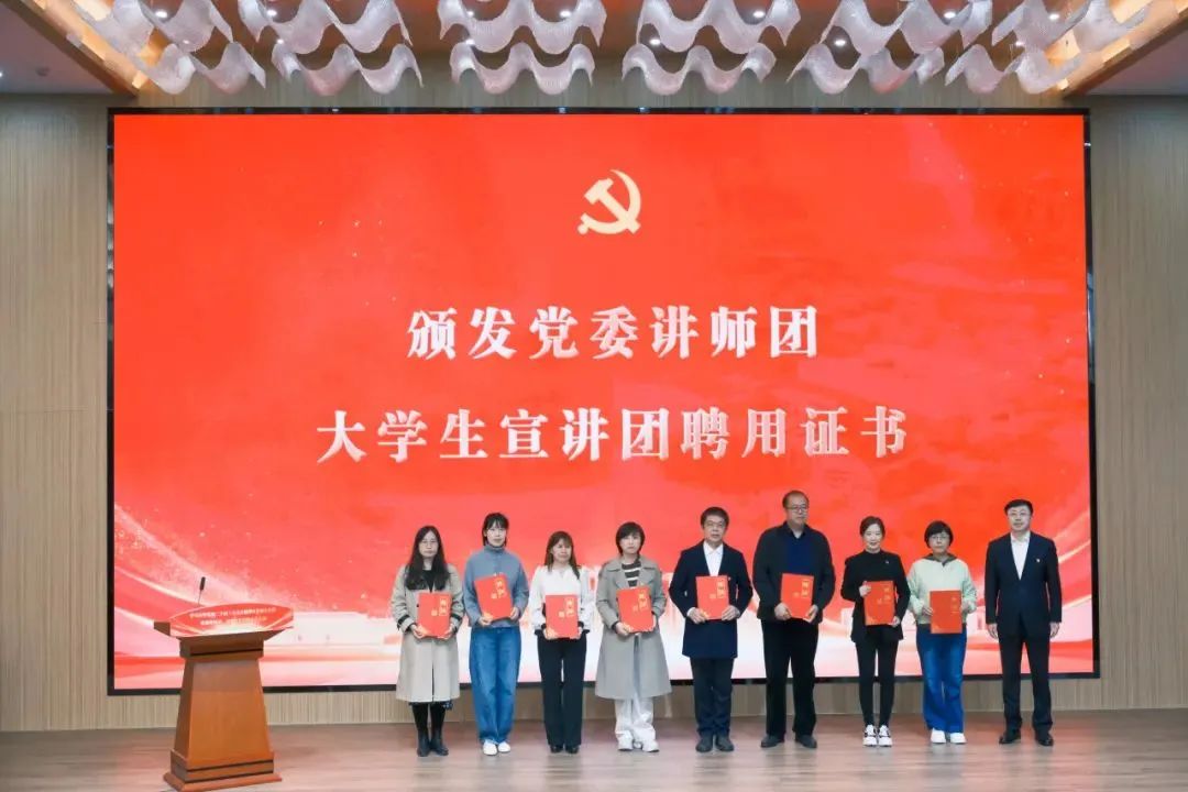党委书记范振伟为学校学习宣传党的二十届三中全会精神党委讲师团、大学生宣讲团代表颁发聘书。
