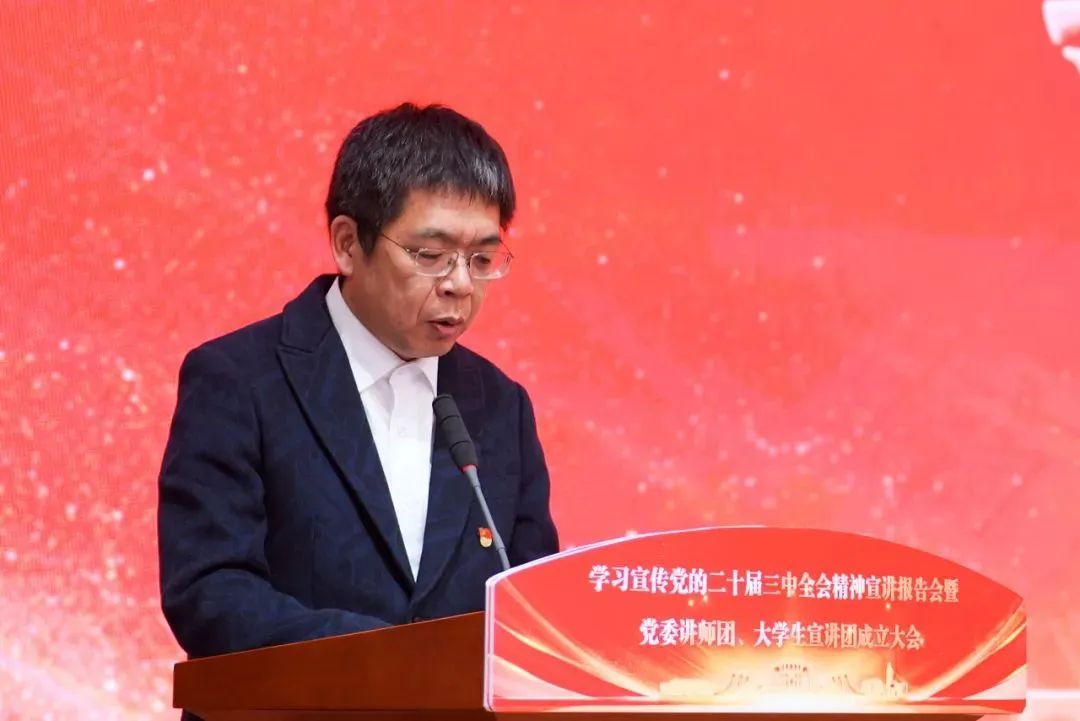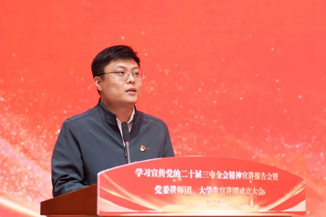 马克思主义学院院长曲洪波教授作为党委讲师团教师代表进行发言。他表示,全体宣讲团成员要提高政治站位,抓住重点突出主题,深刻领会学习好贯彻好党的二十届三中全会精神的重大意义;要深入宣讲习近平总书记关于全面深化改革的一系列新思想、新观点、新论断,结合高校具体工作实践学好讲好用好全会精神;要把宣讲全会精神与实现辽宁全面振兴三年突破行动结合起来。