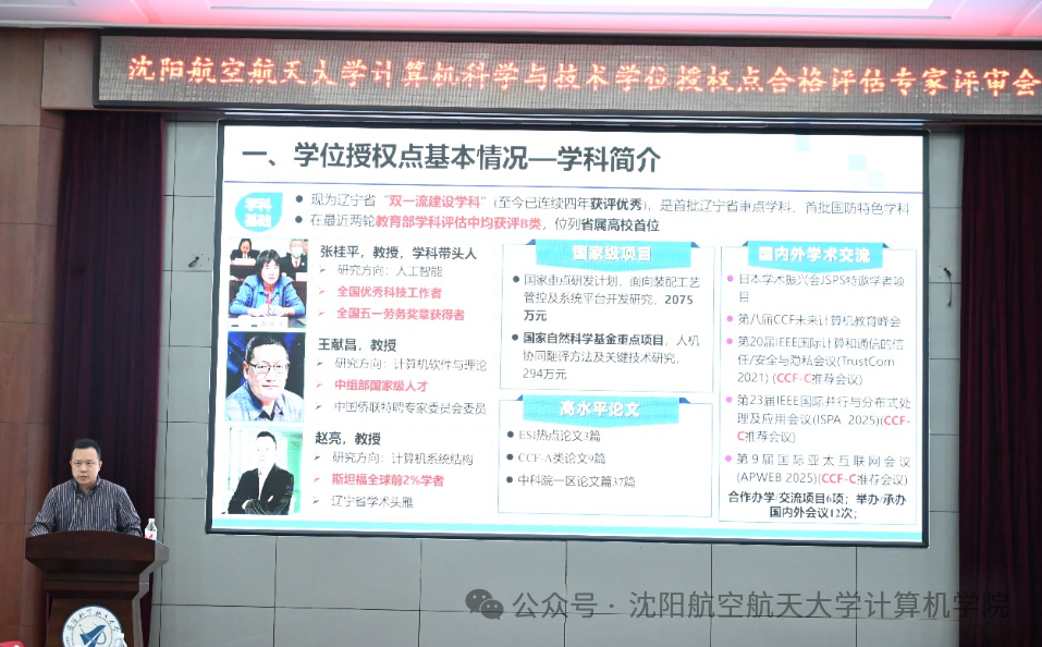 计算机学院院长赵亮教授从计算机学院培养目标、培养方向、师资队伍、核心课程、科学研究、学术交流、制度建设等方面对计算机科学与技术一级学科硕士学位授权点情况进行了全面深入汇报。