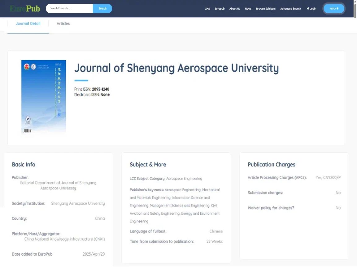 以下是期刊在EuroPub数据库中的期刊主页链接:https://europub.co.uk/journals/journal-of-shenyang-aerospace-university-J-32501