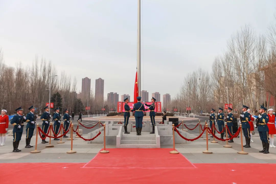 国旗护卫队以挺拔俊逸的身姿、坚定整齐的步伐护送国旗进场。五星红旗冉冉升起,师生庄严高唱国歌,以青春热血,守护国旗荣光!