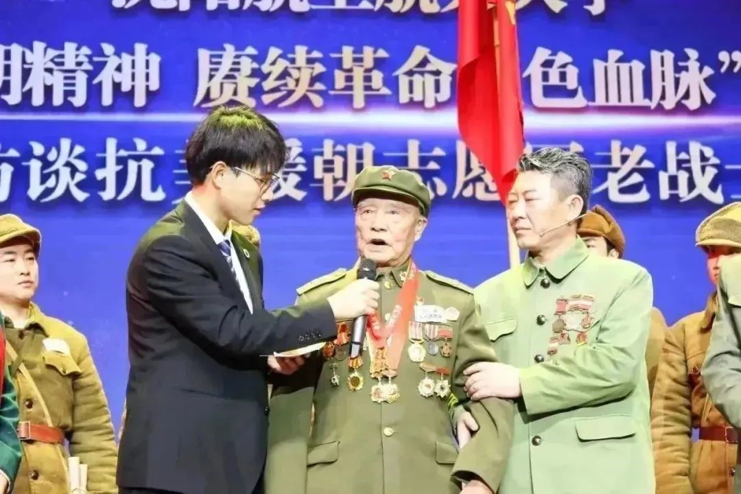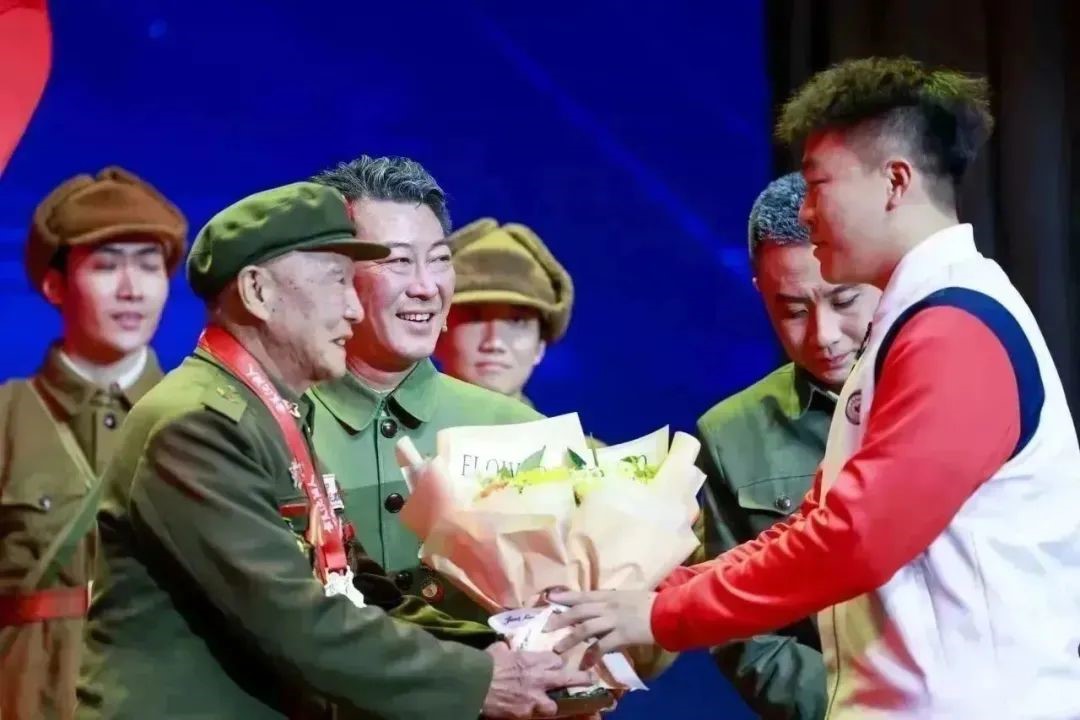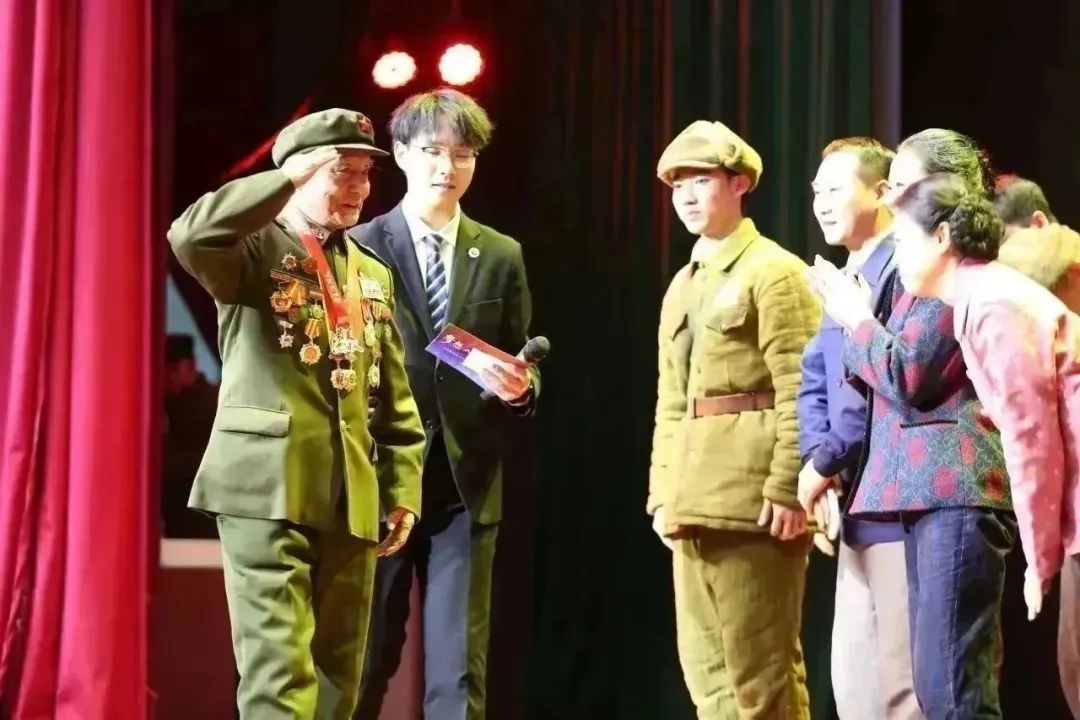 “向我开炮,向我开炮!”当这句经典的台词响起时,全场观众无不动容,学校现场邀请到一位特殊的嘉宾——抗美援朝老战士李维波。这位老战士曾经奋战在抗美援朝的战场,2014年,第一批在韩志愿军烈士遗骸回国,他穿好军装迎接志愿军烈士遗骸归国。今年11月23日,又一次亲自迎接在韩中国人民志愿军烈士遗骸回国。演出结束后,师生代表为这位抗美援朝老战士献上鲜花,现场观众和全体演职人员向这位英雄的老人致以最崇高的致敬!