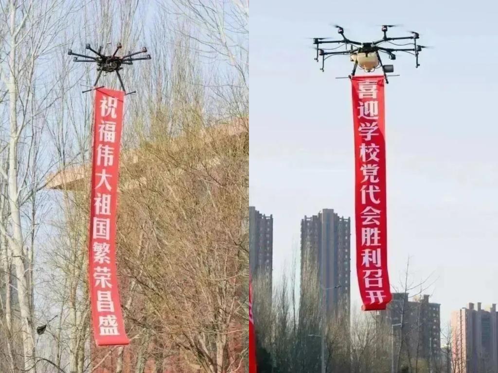 升旗仪式上,由学校通航研究院和学生社团航模队、飞行队共同制作飞行的多轮旋翼无人机带着祝福祖国、喜迎党代会的条幅飞上蓝天。