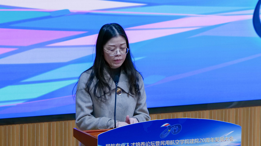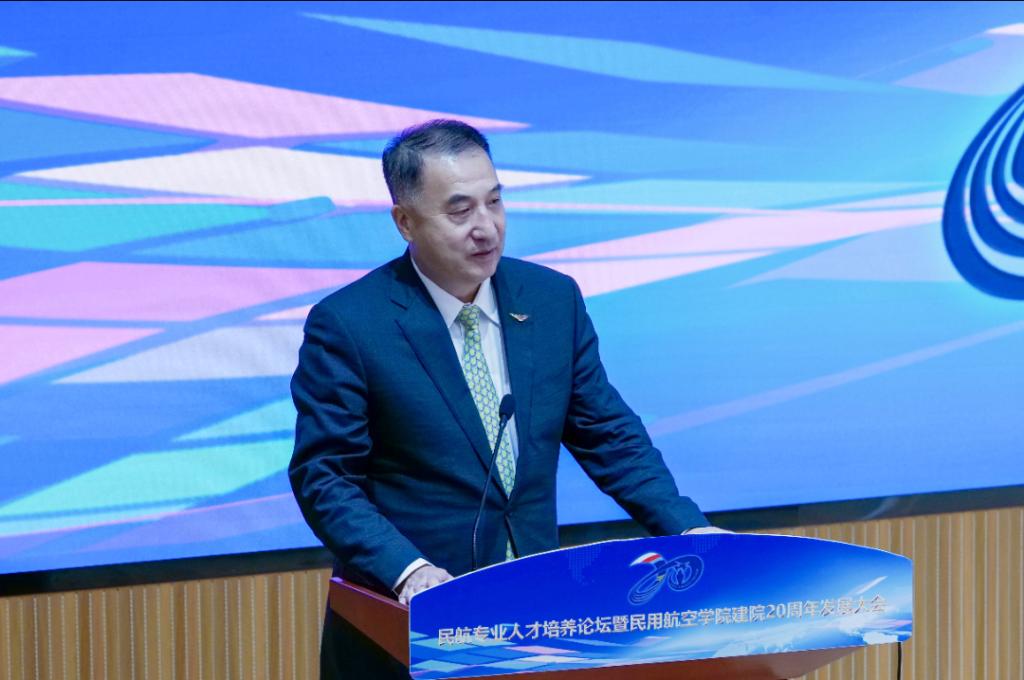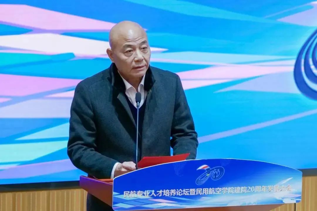 民航局原副局长董志毅致辞,对民用航空学院建院20周年表示热烈祝贺。他表示民航学院作为民航人才重要的培养院校,在不断探索和创新中积累了宝贵的办学经验,形成了鲜明的办学特色,为我国民用航空事业的发展作出了不可磨灭的贡献,祝福民航学院能秉承培养优秀民航专业人才的初心,乘风而上;能够顺应高等人才培养的趋势,逆风飞扬;能够把握民航行业发展的机会,直上云霄。
