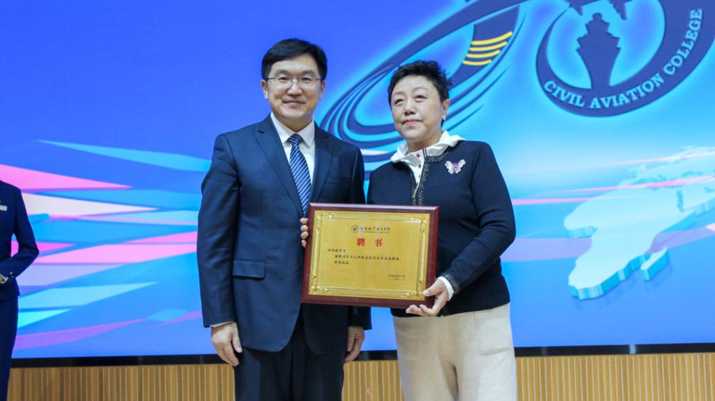 校长李润东为中国航空运输协会理事长助理、客舱乘务工作委员会主任冯润娥颁发客座教授聘书